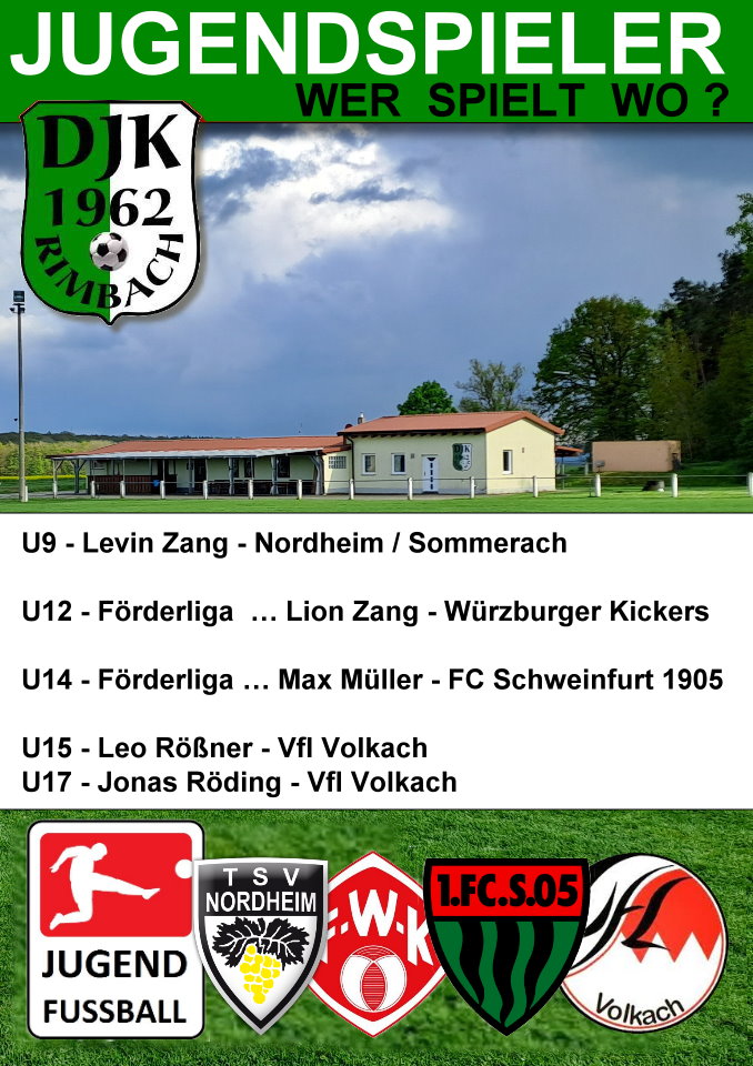 NEWS 27.März/25 - Am Sonntag findet bereits das letzte Heimspiel der Saison in Rimbach statt. Die 2.Mannschaft trifft am Sonntag (30.03.) auf unserem DJK Gelände auf das Team der SV Mönchstockheim. NEWS 20.März/25 - An Karfreitag den 18.April findet ab 17:30 wieder das Fischessen in unserem Vereinsheim statt. Bitte denken Sie daran das sie ihren Fisch bis zum 8.April vorbestellen müssen. Sie können auch dieses Jahr unter Forelle geräuchert, Forelle gebacken, Seelachsfilet, Fischstäbchen, Spiegelei/Rührei und Matjes auswählen.